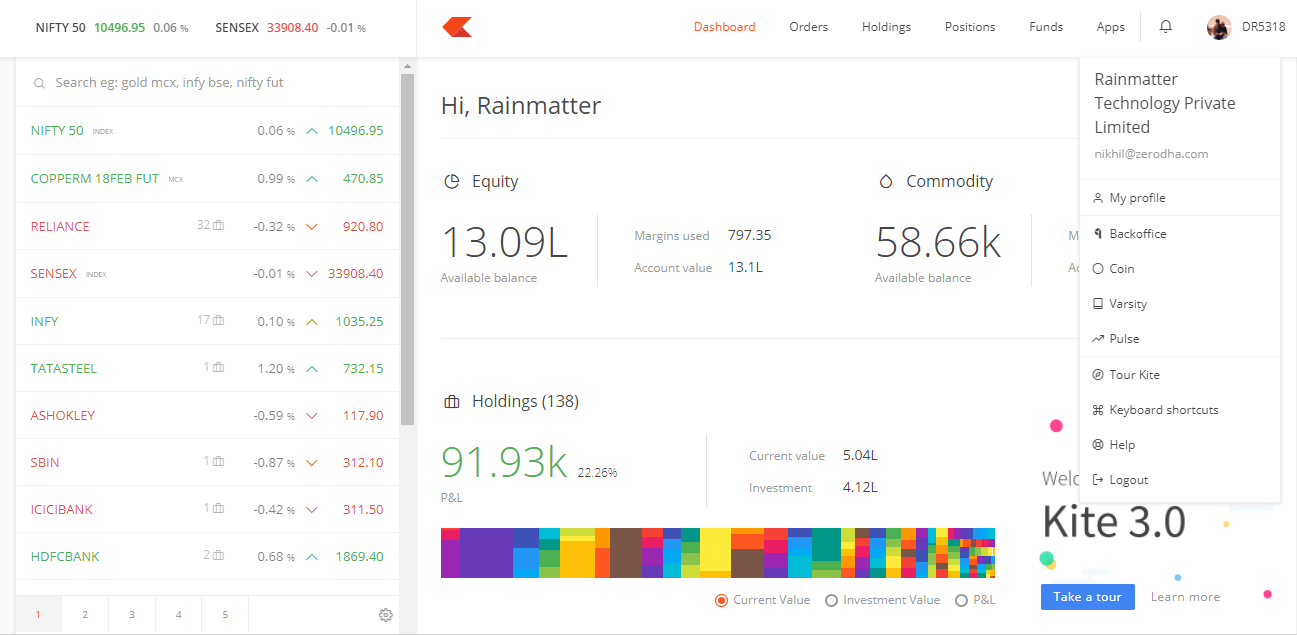 Logging into Zerodha Kite, you’re greeted with a dashboard that presents an overview of your funds and holdings. Your watchlist on the left can be organized into various tabs.
